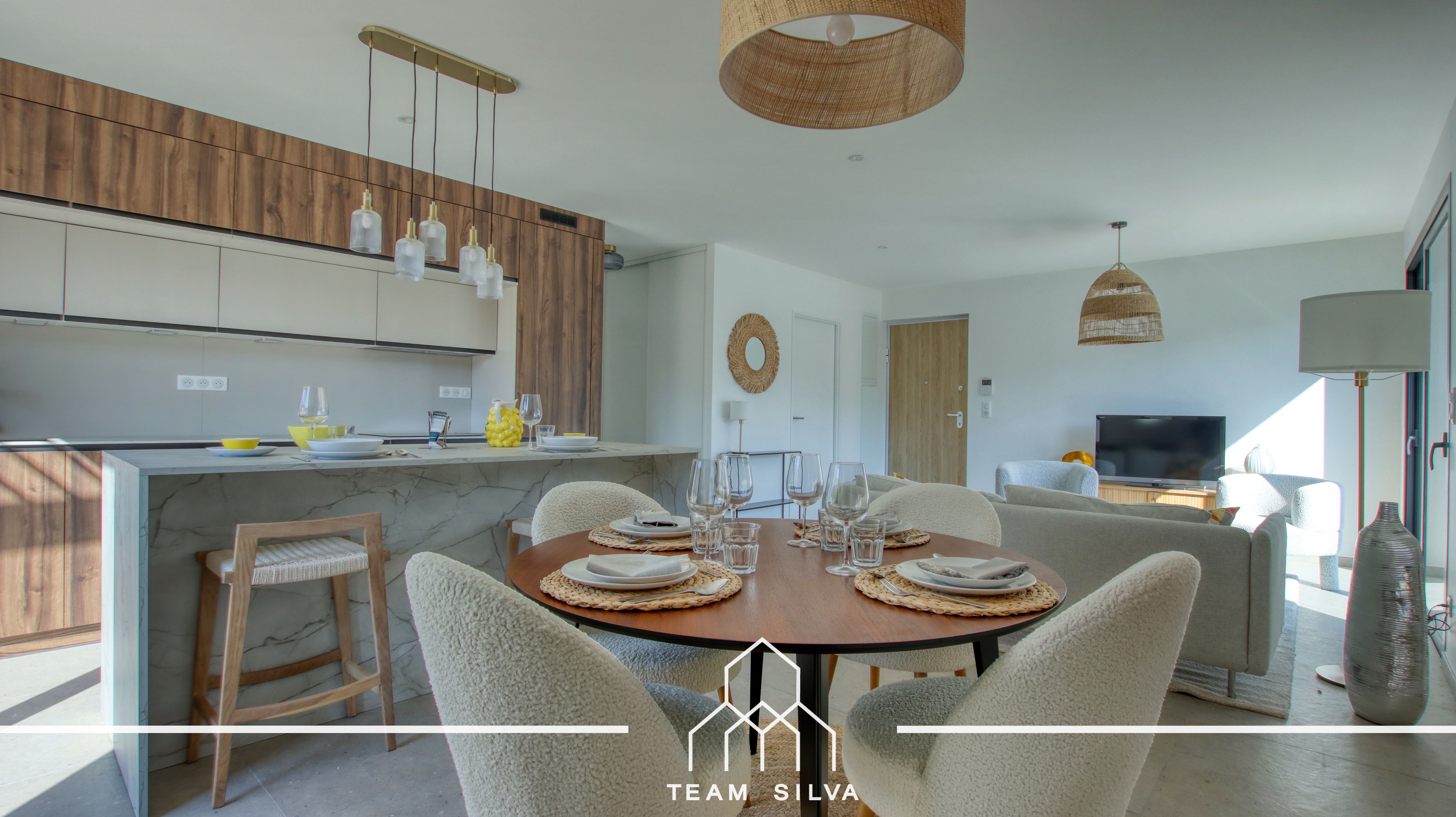 Belle pièce de vie lumineuse de 38m² avec cuisine ouverte entièrement équipée.