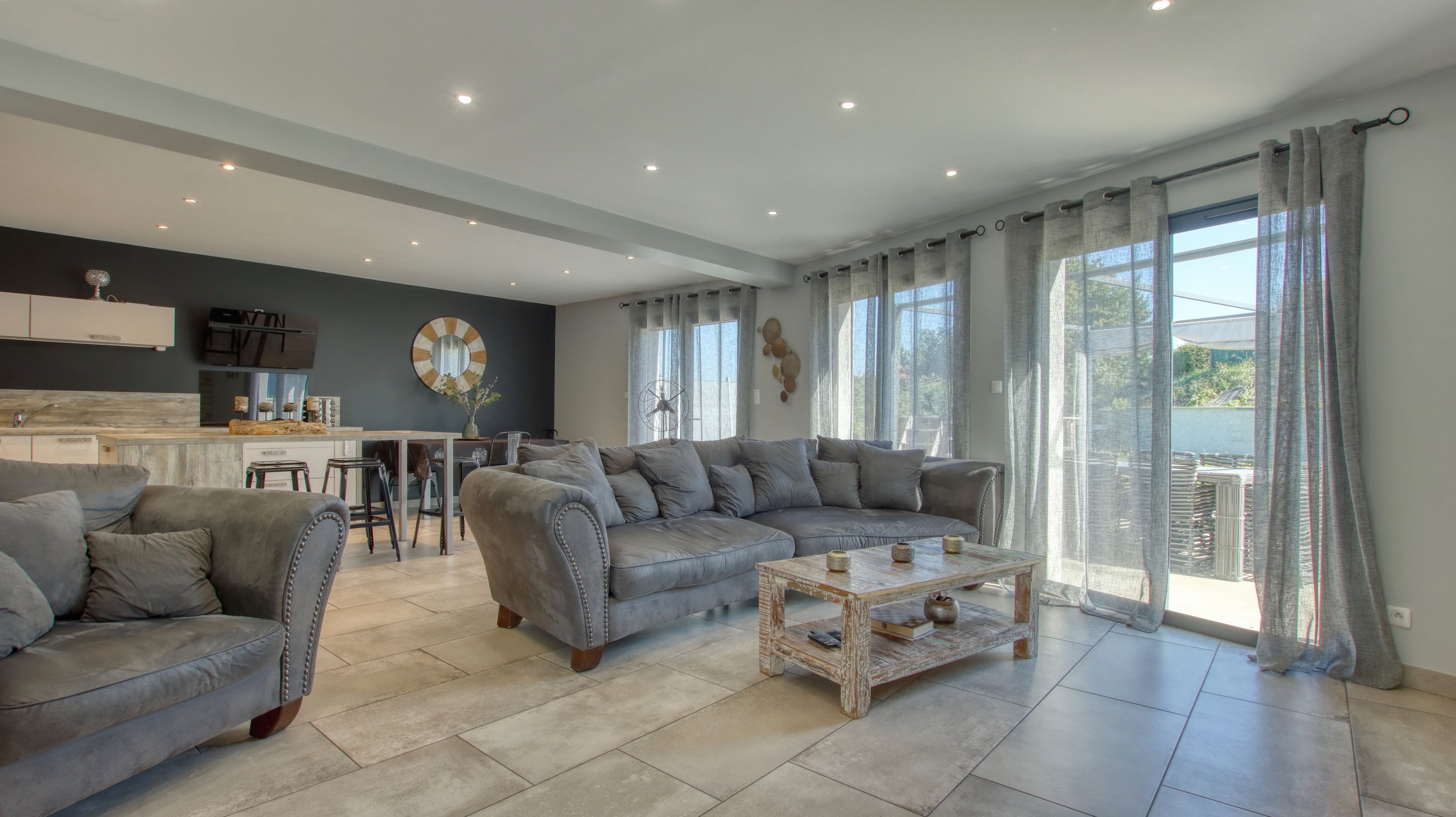 Très belles prestations générales : Doubles vitrages Aluminium oscillo battants avec volets roulants électriques pour plus d’économies, Carrelage et Faïence grand format, Cuisine haut de gamme... Chauffage individuel avec pompe à chaleur au sol.