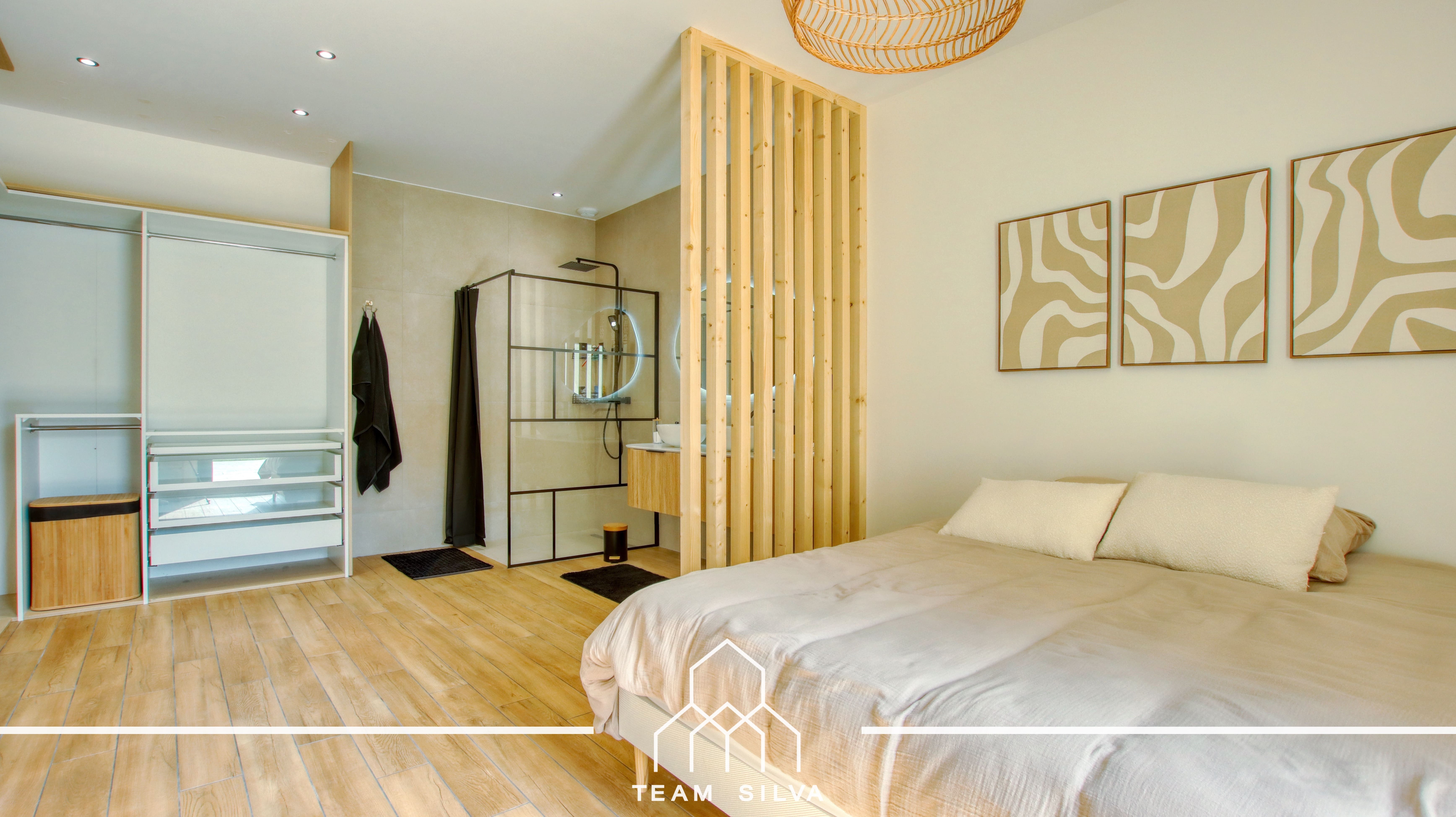 A l'extrémité de la maison, vous disposerez de la partie parentale distribuée d'une suite de couchage de 25m² avec salle d'eau privative et espace dressing, d'un coin buanderie et d'un WC séparé.